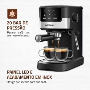 A Cafeteira Espresso Dolce Crema 20 Bar Mondial é perfeita para os amantes de um café encorpado e marcante. Com pressão de 20 Bar, ela extrai os sabores mais ricos e intensos do café moído, resultando em uma bebida cremosa e cheia de aroma. A Dolce Crema oferece versatilidade, permitindo a preparação de uma variedade de bebidas à base de café, desde espressos curtos e encorpados até lattes e cappuccinos cremosos. Além disso, a cafeteira também é compatível com adaptadores para bebidas de cápsulas, que são vendidos separadamente.