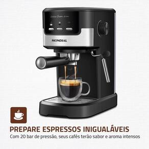 A Cafeteira Espresso Mondial Dolce Crema é ideal para quem aprecia um café encorpado e cheio de sabor. Com pressão de 20 Bar , ela extrai os aromas mais ricos e intensos do café moído, resultando em uma bebida cremosa e irresistível. Versátil, a Dolce Crema permite preparar diversas bebidas, desde espressos curtos e intensos até lattes e cappuccinos suaves e cremosos.