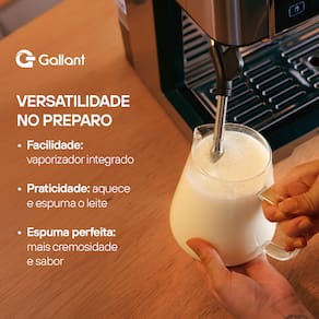 Para preparar seu café com a Cafeteira Espresso Gallant Digital Due Nero20 Bar, comece adicionando os grãos no compartimento de 250 g e ajuste a intensidade desejada no painel digital. Acione a função de moagem para que o café seja moído na medida certa e depositado no porta-filtro. Em seguida, posicione o porta-filtro na máquina e selecione a função de preparo para 1 ou 2 xícaras, extraindo o café com pressão de 20 bar para máxima cremosidade e sabor. Para cappuccinos ou lattes, utilize o vaporizador acoplado, mergulhando-o no leite e girando a válvula até obter a espuma desejada. Em poucos minutos, você terá sua bebida pronta, combinando aroma, sabor intenso e cremosidade perfeita, sem precisar de passos complexos.