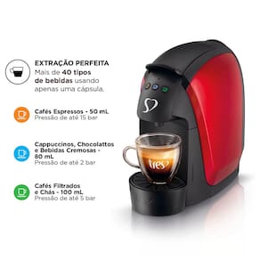 Cafeteira espresso automática TRES 3 Corações Luna, design moderno e compacto, sistema multipressão (2 e 15 bar), reservatório de 600ml, prepara espressos, bebidas cremosas, cafés filtrados e chás. Compatível com cápsulas TRES.Pressão
