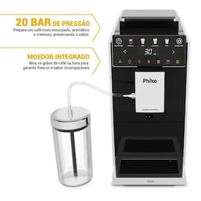 A Cafeteira Philco conta com reservatório de leite de 680ml, permitindo preparar cappuccinos, lattes e leite espumado de forma automática. A quantidade da bebida é personalizável, com ajuste de café entre 25 e 250ml e controle do tempo do leite. O painel amplo e intuitivo facilita o uso até para iniciantes.