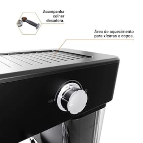 -Pressão de 20 Bar: Extrai todo o sabor do café, garantindo crema perfeita e aroma intenso. -Reservatório de 1,2L Removível: Fácil de encher e limpar, ideal para até 2 xícaras por preparo. -Potência de 950W: Aquecimento rápido, garantindo café pronto em instantes. -Saída de Vapor com Controle: Perfeita para cappuccinos, lattes e outras bebidas especiais. -Filtro Removível com Duas Opções: Preparo de 1 ou 2 xícaras conforme sua necessidade. -Área de Aquecimento para Xícaras: Mantenha suas bebidas na temperatura ideal. -Indicador de Nível de Água e Luz de Funcionamento: Mais praticidade e controle no uso diário. -Design Elegante em Aço Inox: Combina com qualquer cozinha.