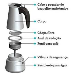 Ficha técnica - Material da estrutura: Aço inoxidável - Com emissão de vapor: Não - Tempo de preparação: não informado pelo fabricante - Com indicador de água: Não - Tipo de filtro: Permanente - Inclui temporizador: Não - Potência: não - Tecnologia: Manual - Com função de aquecimento de canecas: Não - Modelo alfanumérico: não - voltagem: Não se aplica - Capacidade de canecas: 6 xícaras - Cor principal: Cinza - Inclui bandeja coletora removível: Não - Modelo detalhado: Cafeteira italiana 6 xícaras - Com dispositivo de antigotejamento: Não - Capacidade de água: 250ml - Pressão: não informado pelo fabricante - Tipo de cafeteira: Italiana