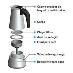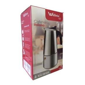 Cafeteira Italiana 6 Xícaras Cafeteira italiana 6 xícarasCafeteira italiana 6 xícaras em aço inox - wellmixa cafeteira é perfeita para se fazer uma saboroso café. Ela tem um ótimo acabamento. Sua funcionalidade é excelente e sua praticidade não deixa nada a desejar. É só usar a primeira vez para não querer mais usar outras similares nas horas mais importantes do dia a dia. Ótimo cafeteira para presentear. Bem pratica, leve em viagens , irá te poupar de carregar mutos vasilhas para fazer o café, basta uma.Possui válvula de segurança.Não precisa de filtro de papel nem de tecidoprática de usar e fácil para limparfeita em inox.Capacidade aproximada - 300ml.Serve 6 xícarasCompletamente desmontável para limpeza inox polidoResistente e durávelMedidas: altura 19cm largura 10cmTodas as informações divulgadas são de responsabilidade do fabricante/fornecedor.Imagens meramente ilustrativas.Contém 1 unidadeComposição: inox e plásticoFicha técnica- Material da estrutura: Aço inoxidável- Com emissão de vapor: Não- Tempo de preparação: não informado pelo fabricante- Com indicador de água: Não- Tipo de filtro: Permanente- Inclui temporizador: Não- Potência: não- Tecnologia: Manual- Com função de aquecimento de canecas: Não- Modelo alfanumérico: não- voltagem: Não se aplica- Capacidade de canecas: 6 xícaras- Cor principal: Cinza- Inclui bandeja coletora removível: Não- Modelo detalhado: Cafeteira italiana 6 xícaras- Com dispositivo de antigotejamento: Não- Capacidade de água: 250ml- Pressão: não informado pelo fabricante- Tipo de cafeteira: Italiana Marca: Shopbr Ean: 7896191728273