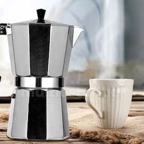 Cafeteira Italiana Express faz 9 Xícaras Produzida com material de alta qualidade e segurança, traz mais praticidade para seu cafezinho do dia a dia. A cafeteira Italiana tem um processo de pressão, modelo tradicional europeu. O processo de preparação do café é feito de baixo para cima. A água ferve na caldeira, passa pelo pó do café que está no funil e por fim, o café chega no recolhedor e está pronto para ser servido. Dispensa o uso de filtros de papel ou de pano. Faz de 01 (uma) a 09 (nove) xícaras. ESPECÍFICAÇÕES: Tamanho: 10cm Diâmetro x 19cm Altura Material: Alumínio - Faz até 9 xícaras Contém: 01 Xícara Italiana