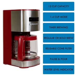 SimCafeteira Kenmore com 12 xícaras, filtro reutilizável, temporizador programável, visor digital, garrafa de vidro com controle de aroma, filtro de água, carvão, regular, aço inoxidável e vermelho
