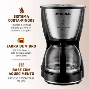 A Cafeteira Elétrica C-32-32X-R prepara até 32 xícaras de café. Com jarra de vidro fácil de lavar, ela tem porta-filtro permanente, que dispensa filtro de papel. Tem ainda base aquecida para café quente a qualquer hora. Sua jarra de vidro não fica com resíduos e odores e pode ser levada à mesa. Com seu sistema corta-pingos, você pode retirar a jarra para servir o café mesmo durante o preparo. Seu porta-filtro é permanente e pode ser retirado, sendo MAIS econômico e ecológico. Já a tampa basculante traz mais facilidade na hora de colocar a água e o pó de café. Esta cafeteira tem ainda um indicador de nível de água, mostrando quantas xícaras serão feitas, para você passar o café na medida certa. A Cafeteira Elétrica Dolce Arome C32-32X-R foi desenvolvida para uso doméstico.