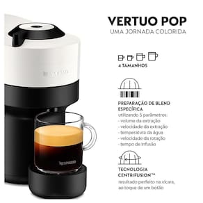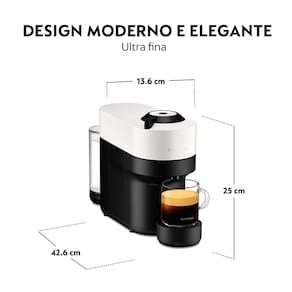 Destaques Sempre o mesmo resultado na xícara Café Nespresso feito na hora, com crema naturalmente formado e café encorpado. Alta Conveniência e Flexibilidade operação simples com um botão, ejeção automática da cápsula de café. Um Design Novo e Divertido Disponível em uma seleção de cores vibrantes. Características Tipo: Espresso Manual Tipo de Café: Cápsulas Capacidade do Reservatório: o,6 litros Pressão (Bars): 26,000 Quantidade de Xícaras: 08 Tipos de Bebidas: Café Bandeja para Resíduos Trava na Tampa Display Indicador do nível de água Reservatório Removível Desligamento Automático Luz Indicadora de Funcionamento Tempo de Preparo: 30 Segundos Especificações Técnicas Modelo: GCV2BR Cor: Branco Coco Potência: 1100W Voltagem: 110V / 220V (não é bivolt) EAN: 7630311562565 (110V) / 7630311562572 (220V) Garantia: 12 meses Dimensões e Peso Dimensões do produto sem embalagem (AxLxP): 250x136x420 mm Dimensões do produto com embalagem (AxLxP): 325x400x265 mm Peso do produto sem embalagem: 3,5 Kg Peso do produto com embalagem: 5,0 Kg Itens Inclusos 01 Máquina 01 Kit de boas vindas Agente Validador Produto possui certificação de segurança compulsória, certificado pela TUV 20.1796, organismo acreditado pela CGCRE do Inmetro.
