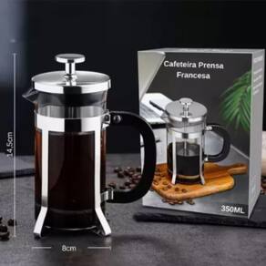 ESPECIFICAÇÕES; Material: Vidro, Inox e Plástico Dimensões: Diâmetro da boca: 7cm x Diâmetro Base: 8cm x Alt.: 14,5cm Peso: Aprox.: 250g Contém; 01 Cafeteira Prensa Francesa Inox 350ml
