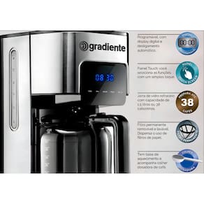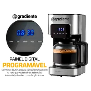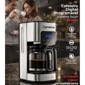 Apresentamos a Cafeteira Digital Programável Touch da marca Gradiente. Desenvolvida para os amantes do café mais exigentes, essa cafeteira combina estilo elegante com funcionalidade avançada. Com capacidade para preparar até 38 cafés, a Supreme Touch oferece uma experiência personalizada de café a cada uso. Sua interface digital intuitiva e programável permite que você programe a hora de início do preparo, garantindo que seu café esteja pronto quando você desejar, seja de manhã cedo ou durante o dia. A tecnologia de ponta da cafeteira garante um café saboroso e aromático a cada xícara. Com seu sistema de infusão otimizado, ela extrai o máximo de sabor e aroma dos grãos de café, proporcionando uma bebida encorpada e deliciosa. A cafeteira Touch possui um design elegante na cor cobre, que certamente se destacará em sua cozinha. Seu acabamento de alta qualidade adiciona um toque de sofisticação ao ambiente, tornando-a não apenas uma máquina de café, mas também um item decorativo. Além disso, a cafeteira apresenta recursos adicionais, como a função de pausa, que permite que você interrompa o processo de preparo para servir uma xícara de café antes que a cafeteira termine de fazer todo o lote. Se você valoriza um café perfeito e adora ter o controle total sobre o processo de preparo, a Cafeteira Digital Programável Touch da Gradiente é a escolha ideal para você. Experimente o prazer de saborear um café excepcional todos os dias.