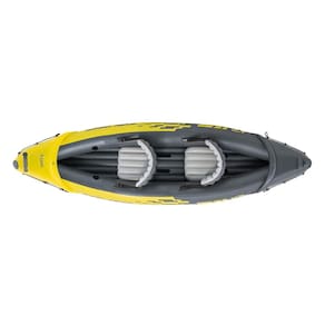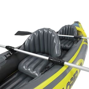 Caiaque inflável com capacidade para 2 pessoas. Seu inovador desenho favorece o processo de remar. Inclui quilha removível, assentos com encosto inflável e ajustáveis, remo de alumínio de 219cm, bomba manual e kit de reparação. Peso máximo 180Kg.Alem do conforto, seu design torna fácil o remar em ambos os lagos e rios suaves, tudo, permanecendo leve e compacto. Sua cabine de pilotagem dispõe de dois bancos ajustáveis com encostos. Feita de robusto vinil de calibre 30 super-resistente para maior durabilidade. Caracteristicas: Marca: Intex Acompanha par de remos de aluminio Super resistente Quilha removivel Banco ajustável com encosto Acompanha bomba de ar manual Capacidade de até 180kg Kit reparação Cabine desenvolvida com conforto e espaço Desenvolvido para tornar o processo de remar mais simples Capacidade de 2 pessoas Dimensões: 312 cm x 91 cm x 51 cm Acompanha comprovação (regua) para que seja inflado de maneira correta (uso imprescindível)