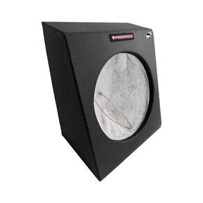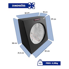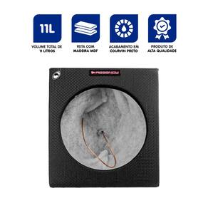 CARACTERÍSTICAS - Dimensões compactas, ideal para instalar em caçambas de pick-ups ou espaços laterais - apertados do veículo; - Volume acústico eficiente: estrutura selada com 11 litros internos, proporcionando controle de pressão e graves mais definidos; - Acabamento resistente: MDF de 15–18 mm com revestimento de courvin perfurado preto e manta isolante acrílica, assegurando isolamento acústico e durabilidade; - Fixação e montagem segura: plugs parafusados com fio e cola branca com serragem garantem encaixe firme e resistente à vibração.