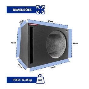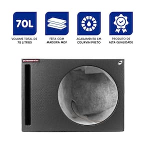 CARACTERÍSTICAS - Capacidade: acomoda 1 subwoofer de 15", ideal para sistemas de som automotivo potentes; - Volume interno eficiente: estrutura com 70 L, proporcionando controle de pressão e graves mais definidos; - Construção resistente: fabricada em MDF de 15–18 mm, revestida com courvin perfurado preto e manta isolante interna; - Design funcional: duto reto frontal que favorece a eficiência acústica e facilita a adaptação em diversos espaços do veículo.