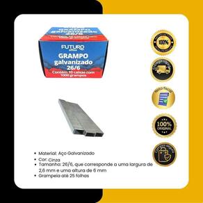 Grampo Galvanizado 26/6 Futuro O Grampo Galvanizado 26/6 - Futuro é uma ótima opção para quem precisa de um grampo de qualidade e durável. O grampo é feito de aço galvanizado, o que o torna resistente à corrosão e ao desgaste. Validade: Indeterminada Marca: Futuro Dimensões cm : 4.00 x 3.00 x 11.00 A x L x P Organização e Durabilidade com Grampo Galvanizado 26/6 - Futuro Sua Solução de Escritório Perfeita Resistência para o Dia a Dia Feitos de aço galvanizado, esses grampos são extremamente resistentes, resistentes à corrosão e ao desgaste. Ideal para quem valoriza produtos de longa duração e quer garantir que seus documentos estejam sempre bem presos. Praticidade e Versatilidade As dimensões compactas Confiança e Segurança Com a marca Futuro, você tem a de adquirir um produto desenvolvido para atender às suas expectativas de qualidade e desempenho. Garanta o Seu Agora Não perca a oportunidade de otimizar seu ambiente de trabalho. Adquira os grampos galvanizados 26/6 e experimente a diferença de um produto confiável e eficiente na organização de seus documentos. Marca: Não Informado
