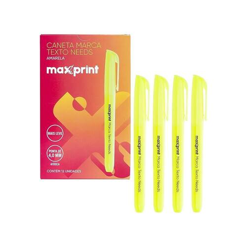 Caixa com 12 Canetas Marca Texto Lumis Amarelo - Maxprint A caneta Marca Texto Lumis da Maxprint é ideal para destacar e ressaltar textos em papel com cores fluorescentes de alta intensidade e excelente resistência à luz. Perfeita para estudos, escritório ou uso pessoal, garante maior visibilidade e organização dos seus materiais. Características Principais: Ponta chanfrada de 4,0 mm, permite traços grossos para destacar ou finos para sublinhar Cores fluorescentes vibrantes, proporcionando destaque eficiente Ponta macia e precisa, para um traço uniforme e sem esforço Tinta à base de água, segura e atóxica Composição: Corpo em resinas termoplásticas Tinta à base de glicol, corante e água Segurança e Certificação: Produto atóxico Quantidade: 12 Unidades Certificação INMETRO - Registro 006 215/2017 Não recomendado para crianças menores de 3 anos Informações Adicionais: Marca: Maxprint Modelo: Lumis Tipo de ponta: Chanfrada de poliéster Cor da tinta: Amarelo Expressura do traço: 4,0 mm Código do produto: 1084052 Código de barras: 7897975002053 A caneta Marca Texto Lumis Amarelo é uma excelente escolha para estudantes, profissionais e qualquer pessoa que queira destacar informações importantes com facilidade, elegância e cores intensas. Marca: Não Informado Ean: 7897975002268