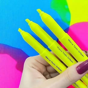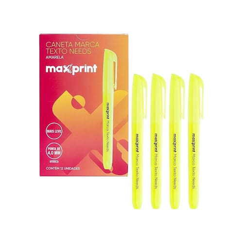 Caixa com 12 Canetas Marca Texto Lumis Amarelo - Maxprint A caneta Marca Texto Lumis da Maxprint é ideal para destacar e ressaltar textos em papel com cores fluorescentes de alta intensidade e excelente resistência à luz. Perfeita para estudos, escritório ou uso pessoal, garante maior visibilidade e organização dos seus materiais. Características Principais: Ponta chanfrada de 4,0 mm, permite traços grossos para destacar ou finos para sublinhar Cores fluorescentes vibrantes, proporcionando destaque eficiente Ponta macia e precisa, para um traço uniforme e sem esforço Tinta à base de água, segura e atóxica Composição: Corpo em resinas termoplásticas Tinta à base de glicol, corante e água Segurança e Certificação: Produto atóxico Quantidade: 12 Unidades Certificação INMETRO - Registro 006 215/2017 Não recomendado para crianças menores de 3 anos Informações Adicionais: Marca: Maxprint Modelo: Lumis Tipo de ponta: Chanfrada de poliéster Cor da tinta: Amarelo Expressura do traço: 4,0 mm Código do produto: 1084052 Código de barras: 7897975002053 A caneta Marca Texto Lumis Amarelo é uma excelente escolha para estudantes, profissionais e qualquer pessoa que queira destacar informações importantes com facilidade, elegância e cores intensas. Marca: Não Informado