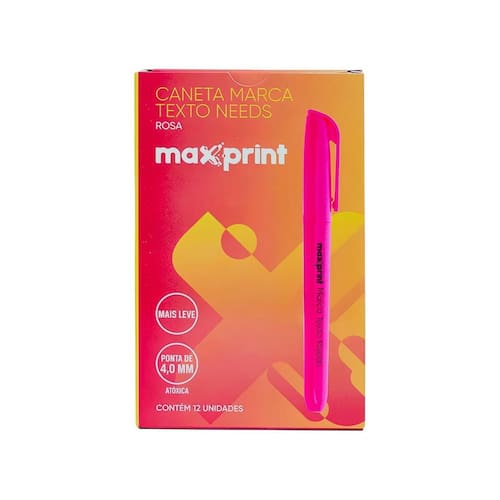 Caixa com 12 Canetas Marca Texto Lumis Rosa - Maxprint A Caneta Marca Texto Lumis da Maxprint é ideal para destacar e ressaltar textos em papel com cores fluorescentes de alta intensidade e excelente resistência à luz. Perfeita para estudos, escritório ou uso pessoal, garante maior visibilidade e organização dos seus materiais. Características Principais: Ponta chanfrada de 4,0 mm, permite traços grossos para destacar ou finos para sublinhar Cores fluorescentes vibrantes, proporcionando destaque eficiente Ponta macia e precisa, para um traço uniforme e sem esforço Tinta à base de água, segura e atóxica Composição: Corpo em resinas termoplásticas Tinta à base de glicol, corante e água Segurança e Certificação: Produto atóxico Quantidade: 12 Unidades Certificação INMETRO - Registro 006 215/2017 Não recomendado para crianças menores de 3 anos Informações Adicionais: Marca: Maxprint Modelo: Lumis Tipo de ponta: Chanfrada de poliéster Cor da tinta: Rosa Expressura do traço: 4,0 mm Código do produto: 1084052 Código de barras: 7897975002053 A Caneta Marca Texto Lumis Rosa é uma excelente escolha para estudantes, profissionais e qualquer pessoa que queira destacar informações importantes com facilidade, elegância e cores intensas. Marca: Não Informado