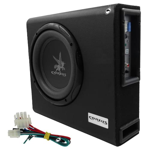 A Corzus CXMS 200 Mini Slim é uma caixa amplificada de subgrave com potência total de 200 Watts RMS com amplificador digital de altíssima eficiência e baixo consumo, qualidade de áudio, resposta senoidal de 20Hz a 110Hz, filtro subsônico, proteção eletrônica e entrada de áudio com opção RCA ou via fio. Por ser uma caixa compacta pode ser instalada embaixo do banco dianteiro de alguns veículos. Ideal para Pick-ups ou usuários que não querem ocupar espaço no porta-malas.