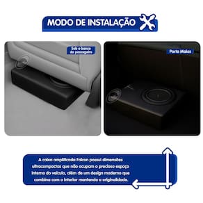 - Compacta e eficiente: Com design slim e subwoofer de 8 polegadas, a Falcon Slim é ideal para veículos com espaço interno limitado, sem comprometer a qualidade do áudio;