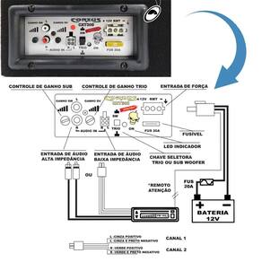 PRINCIPAIS CARACTERÍSTICAS: - Caixa em madeira MDF; - Entrada de Áudio de baixa impedância via fio e alta impedância RCA; - Acionamento automático por áudio na entrada de baixa impedância.