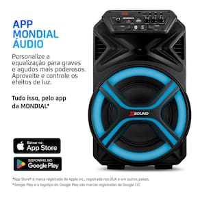 Aplicativo Mondial: Controle tudo direto do celular! Ajuste a equalização como quiser, turbine os graves, realce as melodias e crie efeitos luminosos que acompanham o ritmo da música. Ainda dá para escolher a cor ideal para cada momento.