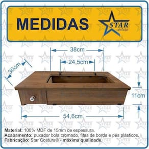 Produto direto da fábricaServe para máquinas de costura singer 15c, vigorelli e elgin pretinha, verdinha, vermelha , modelos facilita, modelos 242, 247. Cor: exatamente igual das fotos deste anúncio. Medidas:Largura: 54cmAltura: 11cmProfundidade: 30cmEncaixe entre 1 pino e o outro: 24,5cmAbertura da máquina: 38x18cm- itens exclusivos star costura Marca: Star Costura