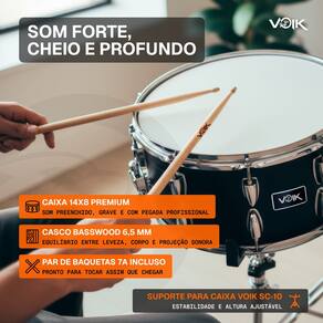 O Kit Caixa de Bateria Voik 14x8 CB14 com Suporte e Baqueta é a escolha ideal para quem busca potência, estabilidade e praticidade. Com casco em madeira Basswood e 8” de profundidade, oferece um som encorpado, com graves marcantes e presença impressionante. O suporte robusto garante firmeza e conforto durante o uso, enquanto a esteira de 24 fios proporciona resposta sensível e definida. Acompanha baqueta Voik de Maple, leve e equilibrada, ideal para tocar com precisão e menos fadiga. Um kit completo, pronto para o palco, ensaio ou estúdio. ? Especificações: Caixa: • Marca: Voik • Modelo: CB14 • Cor: Wood Tone • Pele: Porosa • Casco: Basswood 6,5 mm de espessura • Materiais: Madeira, Metal e PVC • Afinadores: 10 • Aros: Triple Flange 1.6mm • Canoa individual • Esteira: 24 fios • Pele Resposta: Transparente • Timbre: Grave para médio • Circunferência: 14 polegadas • Altura: 8 Polegadas • Peso: 3,868 kg
