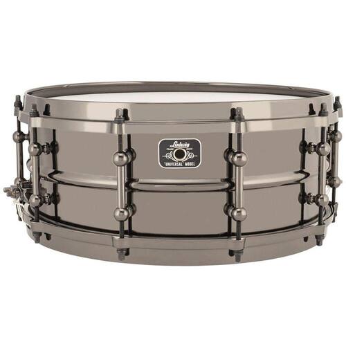 Caixa de bateria Ludwig Universal de Brass Black Magic 14x5,5 com aro die cast Ludwig LU5514 Universal Brass com hardware de níquel preto e aro die cast, 14x5.5