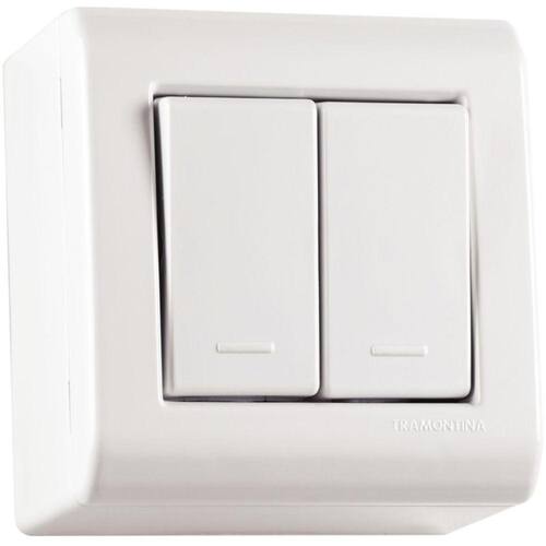 CAIXA C/2 INTERRUPTOR SIMPLES 10A TRAMONTINA.*Iluminar seus ambientes com mais qualidade e eficácia, é com a Caixa de Sobrepor com 2 Interruptores Simples 10 A 250 V Tramontina LizFlex Branca. Perfeita para quem busca o melhor para seus projetos, ela proporciona rapidez e flexibilidade em suas obras, já que sua instalação fica perfeita e não demanda transtornos como quebras de paredes e dispensa o uso de parafusos. Ela é fabricada em termoplástico na cor branca e é composta por caixa, tampa com encaixe de pressão e módulos. Além de contar com sistema modular, possui janelas para inserir canaletas de diferentes dimensões. Com a Tramontina, você tem a garantia de espaços funcionais e cheios de estilo!*IMAGEM ILUSTRATIVA**MARCA:TRAMONTINA*CÓDIGO:80323