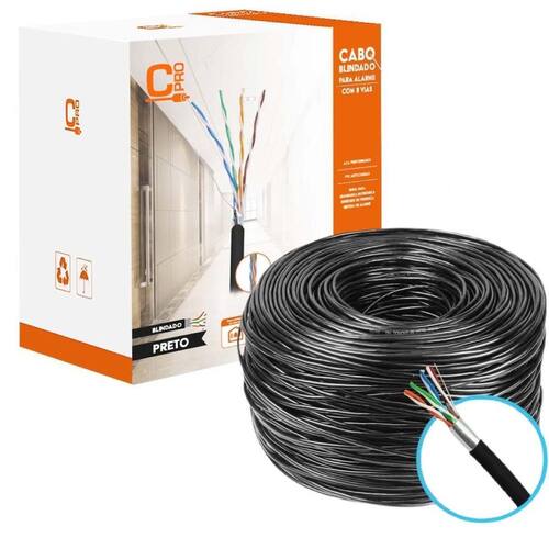 Especificações: - comprimento: 250 metros - isolação: termoplástica - tipo de cabo: 4 pares de cabos trançados 8 vias com blindagem - cor: preto - cat5 - cca alumínio acobreado - ftp blindagem