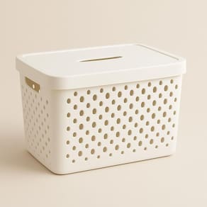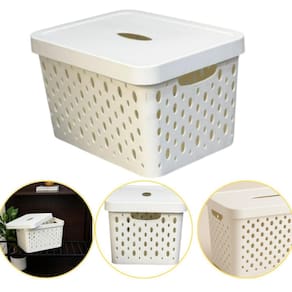 Caixa Cesto Organizador Multiuso Empilhável 17 L Cor Branco DESIGN FUNCIONAL Contorno rebaixado para encaixar o fundo da caixa: Você não precisa deixar a tampa separada ou distante do Cesto, pois o rebaixamento permite que tudo se encaixe perfeitamente, garantindo um acabamento mais ajustado e prático