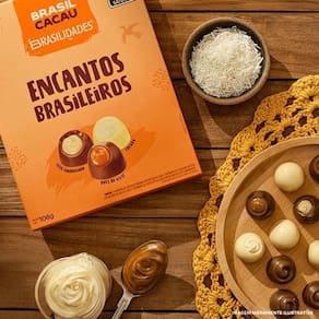 Descubra os sabores mais amados do nosso país com a Caixa Encantos Brasileiros da Brasil Cacau Uma deliciosa seleção de bombons que homenageiam ingredientes tipicamente brasileiros com a qualidade e o sabor irresistível que só a Brasil Cacau oferece.
