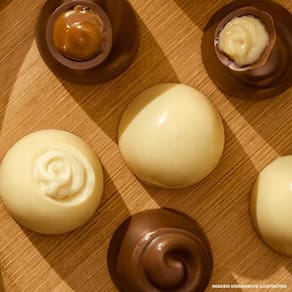 3 Bombons de chocolate branco com recheio de coco 3 Bombons de chocolate ao leite com recheio de doce de leite 3 Bombons de chocolate ao leite com recheio de leite condensado