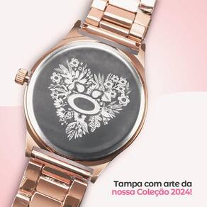 - Relógio Analógico: cor dourada, em aço inoxidável, com tampa personalizada com arte de coração, garantindo um toque único ao seu look.