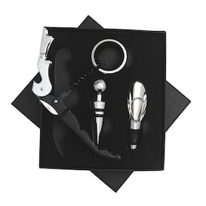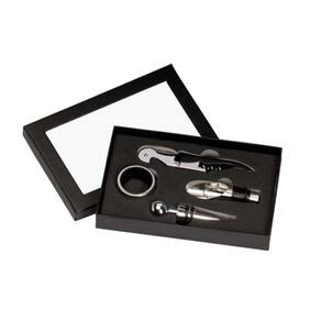 Caixa em papelão revestido 1 corta-gotas para vinho com tampa 1 saca-rolha dois estágios 1 salva-gotas anel 1 tampa para vinho