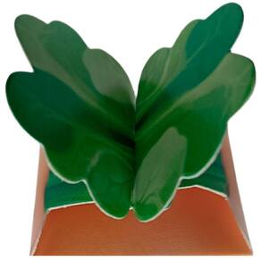 Dimensões: aproximadamente 16 cm de comprimento e 5 cm de largura na altura das folhas