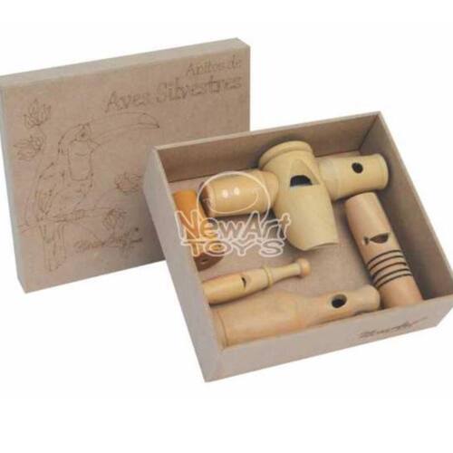 Apitos que compõem a caixa: Marreca Caneleira/Rola/Urú/Grilo/Inhambu-guaçú.