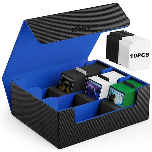 Mlikero Estojo para cartas, caixa de armazenamento de mais de 1800 cartões colecionáveis com 10 divisórias e 3 tampas de espuma, caixa de baralho Commander com fecho magnético de couro, adequada para - ?Organização eficiente de cartões?A caixa de armazenamento de cartões colecionáveis vem com 10 divisórias de cartão e 3 tampas de espuma, ajudando você a organizar seus cartões perfeitamente. O design robusto de fecho magnético garante que a caixa do baralho permaneça firmemente fechada, mesmo quando virada, garantindo a segurança de seus cartões sem nenhum dano. - ?Grande capacidade?Medindo 29 x 25 x 10,7 cm, a caixa de cartão acomoda facilmente mais de 1800 cartões com capa, mais de 1100 cartões de manga dupla e mais de 2400 cartões sem manga, atendendo a todas as suas necessidades de armazenamento de cartões. - ?Durabilidade superior?Feita de materiais de alta qualidade, nossa caixa de baralho TCG possui um exterior à prova d'água e um forro de microfibra macio, oferecendo proteção abrangente para seus cartões contra arranhões, vincos e outros danos. O material externo resistente e durável melhora a sensação tátil e a aparência elegante da caixa de cartões colecionáveis, garantindo proteção perfeita para todos os seus cartões. - ?Caixa de armazenamento de cartões versátil?Habilmente projetada para jogadores de cartas, nossa caixa de armazenamento de cartões é adequada para uma ampla variedade de cartões colecionáveis. É compatível com MTG, PKM, TCG, bem como cartões de futebol e beisebol, mantendo sua coleção organizada e aprimorando sua experiência de jogo - ?Presente perfeito para colecionadores de cartões? Lutando para manter seus cartões organizados? Esta caixa de baralho Commander é a melhor solução, mantendo sua coleção limpa enquanto faz um presente atencioso para amigos e familiares que amam colecionar e jogar. - ?Observação?Não é adequado para protetores de cartão de plástico rígido e suporte de cartão magnético.