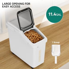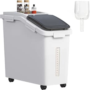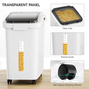 YITAHOME Caixa de armazenamento de farinha de ingredientes grandes de 50 L/40,8 kg, recipiente comercial de armazenamento de arroz de 11,4 galões, 280 xícaras, caixas de armazenamento de farinha a - Grande capacidade de armazenamento: este recipiente de farinha de ingredientes possui uma grande capacidade de 11,4 galões; pode armazenar diferentes ingredientes separadamente, como 110 arroz, açúcar de cozimento, farinha de 40,8 kg, ração seca para animais de estimação de 32 kg e assim por diante. - Design conveniente: nossa caixa de armazenamento de ingredientes de farinha a granel tem uma grande pá transparente para facilitar a seguração; o corpo do barril apresenta um design transparente e uma escala; a grande janela transparente na parte superior permite fácil observação das mudanças internas de estoque - Vedação superior: o recipiente grande de ingredientes de arroz tem uma sucção magnética com 6 fivelas de vedação ao redor; a tira de borracha dentro da capa oferece boa vedação; a tampa superior é projetada com um côncavo para torná-la plana e não escorregar facilmente, permitindo o armazenamento de temperos, copos e tigelas - Movimento fácil: o recipiente de armazenamento de farinha de ingrediente de 11,4 gal está equipado com 4 rodas giratórias removíveis de 360 graus; as rodas facilitam o movimento e o transporte suaves pela cozinha ou sala de armazenamento; use-o de acordo com suas próprias necessidades - Caixa à prova de umidade: a caixa removível à prova de umidade dentro da tampa pode ser usada para colocar desoxidante ou alho para manter os alimentos frescos; o material PP é seguro, resistente e durável para uma longa vida útil