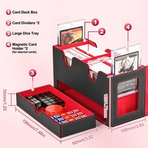 Especificações: Material: couro PU Dimensão: 22,8 x 9,4 x 12 cm / 9 x 3,7 x 4,8 polegadas Cor: preto e vermelho. Peso: 1,45 kg A embalagem inclui: 1 caixa de baralho de cartas. 2 porta-cartões magnéticos. 2 divisórias de cartão. Observações: Medição manual, considere pequenos erros no tamanho. A cor pode haver uma pequena diferença devido a diferentes exibições de tela. Se você não estiver satisfeito com sua compra, imediatamente e ouviremos suas preocupações e nossa equipe de atendimento ao cliente encontrará a solução para a situação. - Exibição de dois comandantes: a caixa de deck duplo é especialmente adaptada para jogadores de EDH de comandante; através da janela de exibição, você pode facilmente olhar para o conteúdo da caixa sem abrir a caixa; dois porta-cartões de 35pt incluídos podem mostrar o cartão claramente - Durável e funcional: a caixa de baralho de cartas é feita de exterior de couro PU que oferece boa proteção e interior de microfibra macia para proteger seus cartões de arranhões; a ampla abertura em forma de U garante fácil acesso aos seus cartões, tornando-o conveniente - Grande capacidade: esta caixa de baralho funciona com cartas sem manga, cartões de manga única, cartões de manga dupla; cada capa pode conter mais de 140 cartas de manga única ou mais de 100 cartas de manga dupla; duas divisórias de cartão incluídas permitem que você classifique cartas diferentes - Magnético forte: a caixa de armazenamento de cartões possui um fecho magnético forte que garante que a caixa permaneça firmemente fechada mesmo que seja tombada, fornece boa proteção para todos os tipos de cartões; o design da bandeja de dados ajuda você a armazenar dados e contadores - Boa escolha para colecionadores de cartas: o estojo de baralho UAONO para cartas colecionáveis é a escolha ideal para jogadores, adequado para armazenar cartas de jogo, cartões esportivos etc. ; Desfrute de jogos de cartas com seus amigos ou familiares; se você tiver alguma dúvida, sinta-se à vontade para entrar em contato conosco