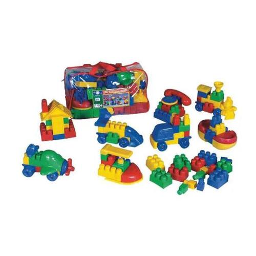 Confeccionado em plástico polipropileno atóxico de alto brilho, de cores vivas, contendo 120 peças com diversos encaixes. Acondicionado em sacola de PVC cristal transparente, com bordas em vivo brilhante e alça de nylon. Produto de qualidade comprovada. Educativos e pedagógicos.