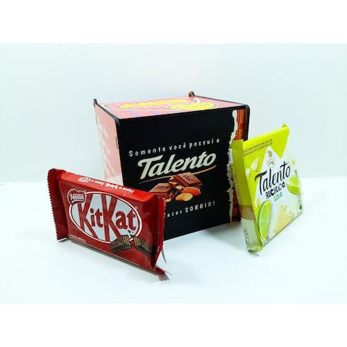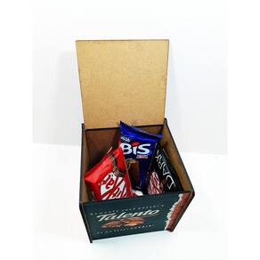 A caixa é feita de MDF e personalizada em todos os lados com imagens bem coloridas e frases de impacto, você pode encher de guloseimas tudo que sua imaginação permitir, e entrega ao seu amado, pois você nasceram um para o outro Acompanha 4 chocolates no kit, os sabores enviados será de acordo com o estoque no momento.