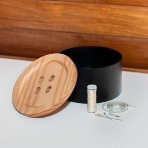Estilosa, no formato de botão, essa caixa organiza os acessórios de costura e dá personalidade ao ambiente. Tenha agulhas, linhas e tesoura, sempre à mão, para aqueles imprevistos. Produto de aço, sem divisórias internas e com a tampa de madeira com suas variações de tonalidades e veios que possuem uma identidade única. A madeira utilizada é certificada de reflorestamento. Produto fabricado no Brasil. A Coleção Beauty é inspirada nas mulheres apaixonadas por acessórios, que curtem moda e beleza, arrasam no look e são uma inspiração para outras mulheres. Sugestão de presente para quem ama costurar. Os acessórios de costura não acompanham o produto. Conteúdo da Embalagem: 1 caixa. Cor: preto fosco, nogueira. As cores e acabamento do produto podem sofrer variação de acordo com a configuração da sua tela. Altura: 9cm Largura: 15cm Profundidade: 15cm Composição/Material: chapa de aço, pintura epóxi, madeira pinus certificada. Produto fabricado com madeira natural, pode apresentar diversidade de cor, textura e nós próprios da árvore que é extraída. Embalagem: plástico termo encolhível. Dicas de Uso: Produto indicado para áreas internas, evitar ter contato direto com água. Instruções de Conservação: limpar com pano levemente umedecido, não utilizar solventes e abrasivos.