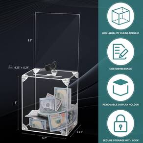 - SEGURANÇA E PRIVACIDADE: A caixa de doações é equipada com uma fechadura segura e duas chaves, que protegem sugestões, cédulas ou dinheiro contra perdas, e garantem que o dinheiro ou o papel permanecerão seguros e secos por dentro.