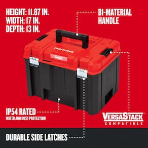 Caixa de ferramentas CRAFTSMAN VERSASTACK Deep, com fechadura, 17 polegadas. (CMST17825) - PROTEÇÃO CONTRA ÁGUA E POEIRA: classificação IP54 - FÁCIL E CONFORTÁVEL: alça bimaterial na parte superior de cada unidade para elevação fácil e confortável - ARMAZENAMENTO: volume extra grande para alto armazenamento de ferramentas - ACESSO RÁPIDO: bandeja removível para acesso rápido às ferramentas mais usadas - RESISTENTE À FERRUGEM: travas de metal pesado para resistência à ferrugem