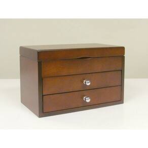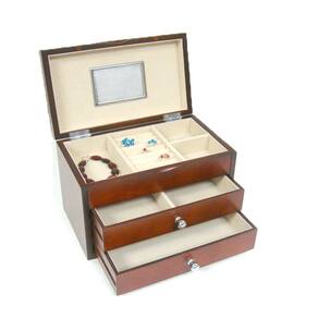 de caixa de joias tem 2 gavetas e bandeja de cima que tem mais de armazenamento para acessórios pequenos.