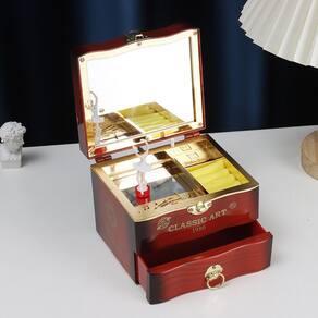 Material: PVC Tamanho: 13,5 x 11,5 x 10 cm Peso: 500 g Aparência clássica de madeira — Estilizada com acabamento retrô em madeira e detalhes dourados, esta caixa de música combina elegância vintage com funcionalidade prática de armazenamento. Característica de bailarina dançante — O interior apresenta uma delicada estatueta de bailarina que gira graciosamente ao som da música, encantando crianças e amantes do balé. Armazenamento de joias espaçoso — Projetado com compartimentos organizados e uma gaveta removível, oferecendo amplo espaço para guardar anéis, brincos e lembranças. Tampa de espelho embutida — A tampa interna inclui um espelho transparente, perfeito para arrumar ou adicionar charme decorativo a qualquer penteadeira ou cômoda. Durável e adequado para crianças — Feita de PVC de alta qualidade, esta peça leve e resistente é segura para crianças e é uma ótima decoração de mesa ou quarto.