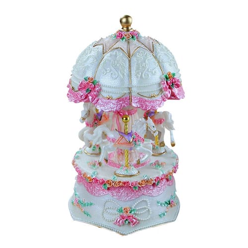 Material: Resina Tamanho: 16x9 cm Design elegante de carrossel floral — Lindamente esculpido com detalhes intrincados de rosas, tons de rosa pastel e quatro cavalos galopando sob uma cúpula decorada. Rotação musical encantadora — Basta enrolá-la para desfrutar de uma música suave enquanto o carrossel gira suavemente, criando uma atmosfera nostálgica e relaxante. Material de resina de alta qualidade — Feito de resina durável com acabamentos requintados pintados à mão, perfeito para exibição a longo prazo. Perfeito para presentear e decorar — Uma escolha atenciosa e encantadora para comemorações de aniversário de meninas, decoração sazonal ou detalhes de mesa. Tamanho compacto e decorativo — mede 16x9 cm, o que o torna ideal para mesinhas de cabeceira, prateleiras ou como uma peça central delicada.