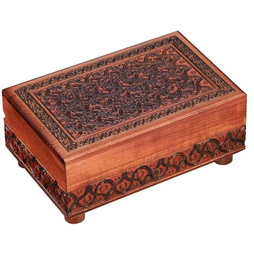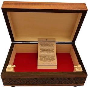 - Parece uma caixa de madeira bem acabada e detalhada da Polônia (o que é), mas há mais do que aparenta! Esta caixa não abrirá se você não souber o truque. Pés giratórios destravam a caixa