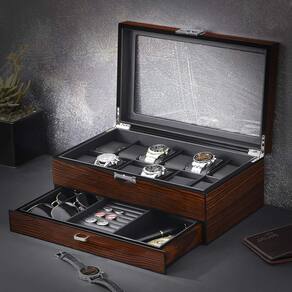 Você precisa de organização para uso do espaço em uma casa com espaço muito limitado. Esta caixa de relógio BEWISHOME com bandeja de joias ajudará você. O design de gaveta dupla pode armazenar outros itens soltos, como elos de relógio, acessórios de relógio, acessórios de carteira e outras coisas que você gosta de trocar diariamente. Alto nível de artesanato, detalhes e funcionalidade, dobradiças guiadas extremamente resistentes e grande janela de visualização, aparência moderna sem parecer futurista e elegante sem ser ostensiva. Fica bem onde quer que você o coloque. Especificações: - Material: placa de fibra de densidade média (MDF), forro de couro sintético - Janela: vidro real - Cor: Caixa de relógio marrom, travesseiros pretos - Dimensões do produto (C x L x A): 13,19" x 8,07" x 5,12" (33,5 x 20,5 x 13 cm) - Janela de vidro: 11,18" x 6,14" (28,4 x 15,6 cm) - Tamanho do compartimento do relógio: 1,97" x 3,54" (5 x 9 cm) - Tamanho do segundo nível: 28.9 cm x 17.4 cm x 4.0 cm (28.9 x 17.4 x 4 cm) - Peso líquido: 3,7 kg Conteúdo da embalagem: - 1 caixa de relógio. - 12 almofadas removíveis. Serviço 100% satisfatório e garantia: Prometemos oferecer 100% de satisfação aos nossos clientes. Se você não estiver satisfeito com sua compra por qualquer motivo, , resolveremos o problema até que você esteja satisfeito. Vamos substituí-lo ou reembolsar seu dinheiro, sua escolha! - Design atraente e artesanato de alta qualidade: o organizador de relógios é feito de MDF, o interior é coberto com couro sintético ultra suave, destaca a beleza única enquanto protege os relógios de arranhões. Cria um único local para todas as joias e você pode facilmente decidir qual deseja usar antes de sair - Capa combo de relógios e joias: design de camada dupla. A primeira camada oferece 12 compartimentos de relógio, tem espaço suficiente para guardar relógios grandes. Quanto à gaveta de puxar, os espaços na lateral são grandes o suficiente para guardar pulseiras extras, brincos, abotoaduras, correntes ou qualquer outra joia pequena. A seção estriada no meio é útil para anéis menores, abotoaduras e joias semelhantes - Tampa grande de vidro real: esta caixa de exibição de relógio tem uma parte superior transparente, você terá uma visão ampla para encontrar seu tesouro mais favorável em segundo, ter tampa de vidro é uma grande vantagem. Se seus relógios são Eco Drives! A luz é capaz de passar e carregar os relógios para evitar que os relógios fiquem empoeirados - Almofadas de alta qualidade: feitas de couro sintético de alta qualidade e almofadas de esponja, indeformáveis e macias, protegendo seus relógios de poeira, umidade e agitação perfeitamente. As almofadas de relógio são dimensionadas para caber perfeitamente nos compartimentos, podem guardar relógios grandes facilmente, servem para pulseiras femininas menores também, evitando esmagar os travesseiros. O tamanho de cada compartimento de relógio é: 9,5 cm C x 4,97 cm L - Ótimo presente com caixa de presente elegante: a caixa de armazenamento do relógio é embalada em uma caixa de presente de luxo. Este é um presente incrível para homens que possuem joias incríveis e precisam mantê-las organizadas. Você pode usar o suporte de relógio como presente para qualquer ocasião, fica maravilhoso combinando com seu camarim